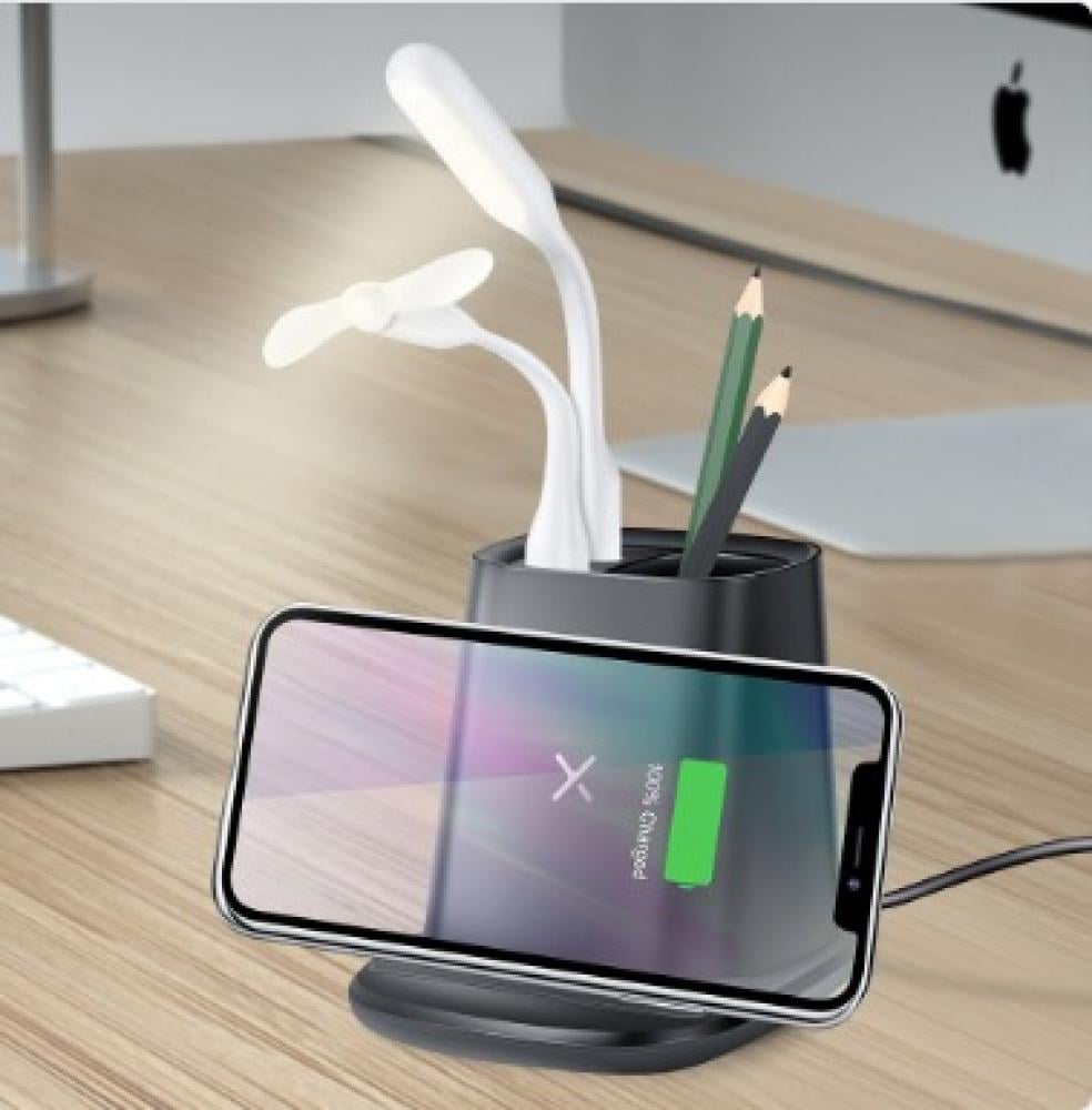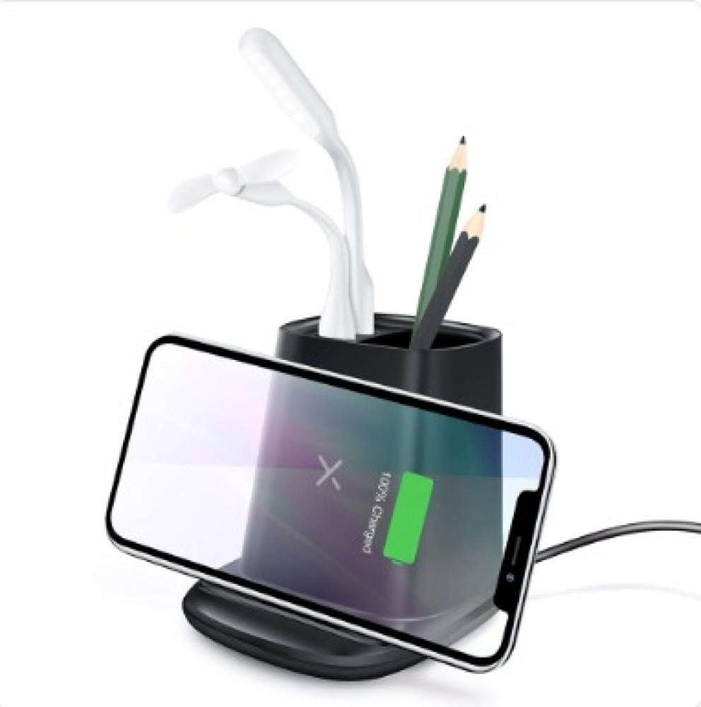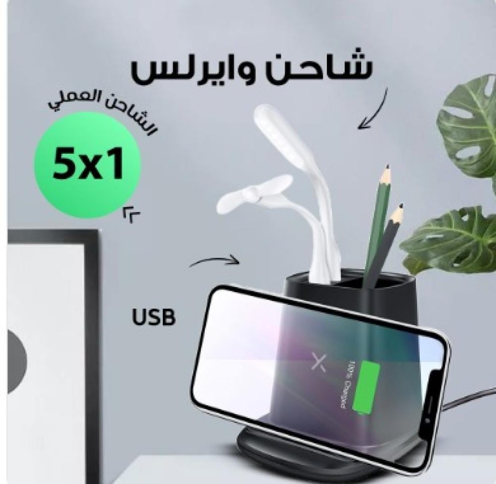 - شاحن وايرلس 5 في 1 يأتي مع قاعدة مريحة لتنظيم الأقلام والأدوات المكتبية.